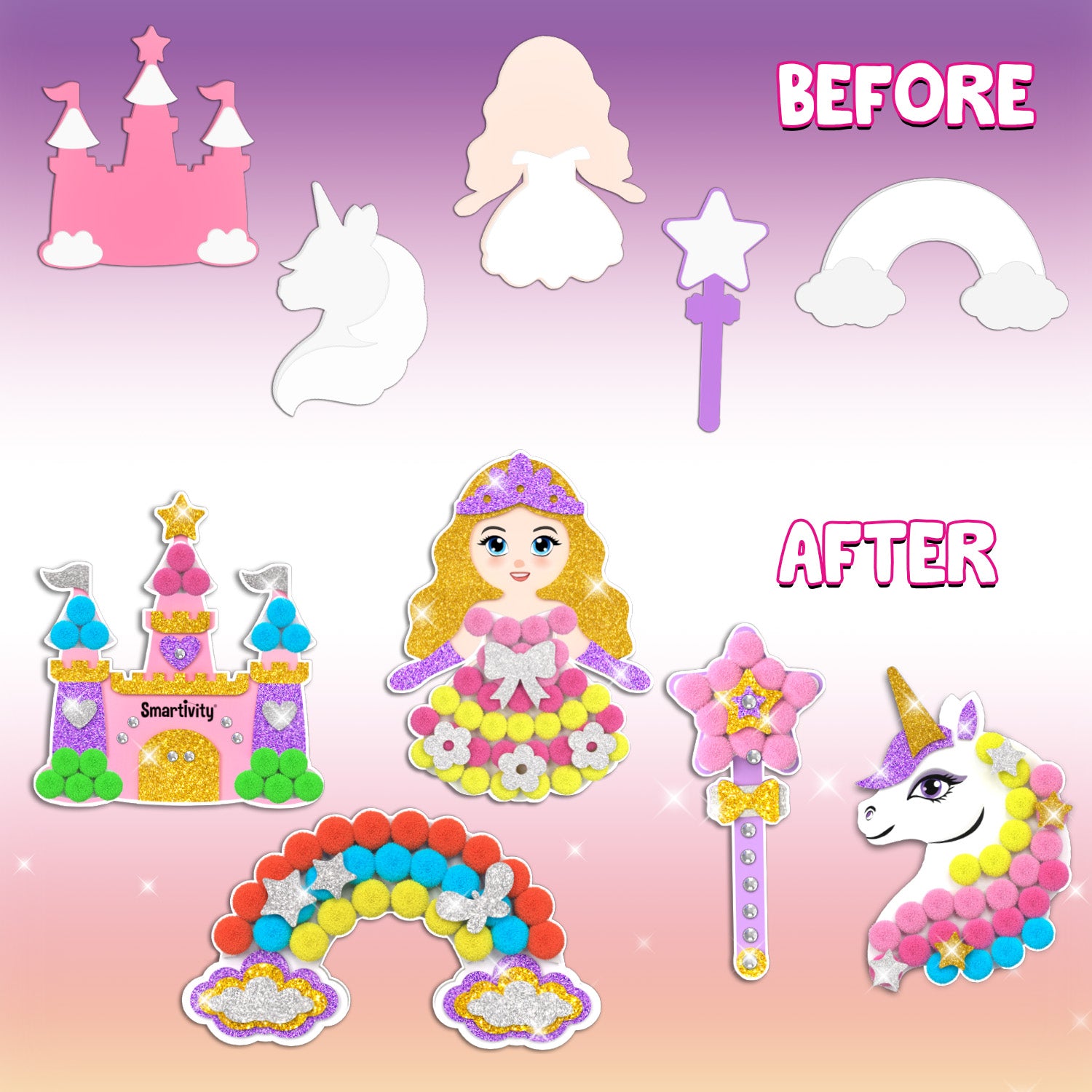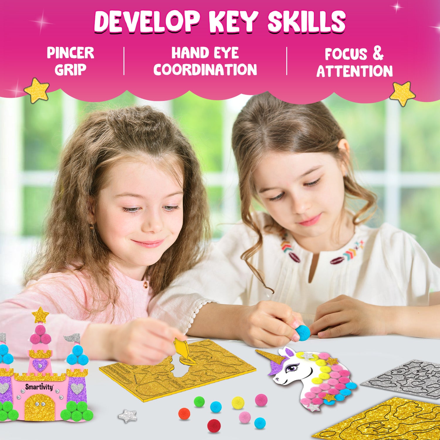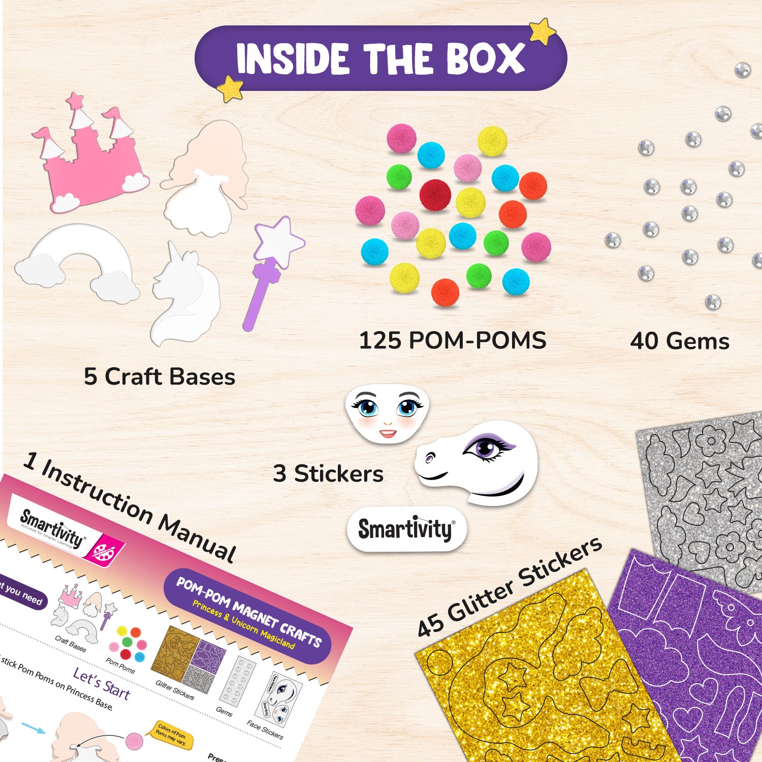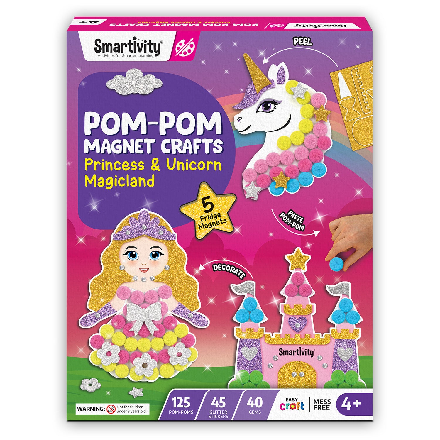 Unleash your child’s creativity and invite a bit of magic into your home! With Smartivity’s Pom Pom Magnet Crafts kit, your little one will use vibrant pom-poms, glittery stickers, and sparkling gems to craft enchanting Princess, Unicorn, Magic Wand, Castle, and Rainbow magnets. With all materials included and simple step-by-step instructions, your child will bring a magical world to life—while developing key skills through play.