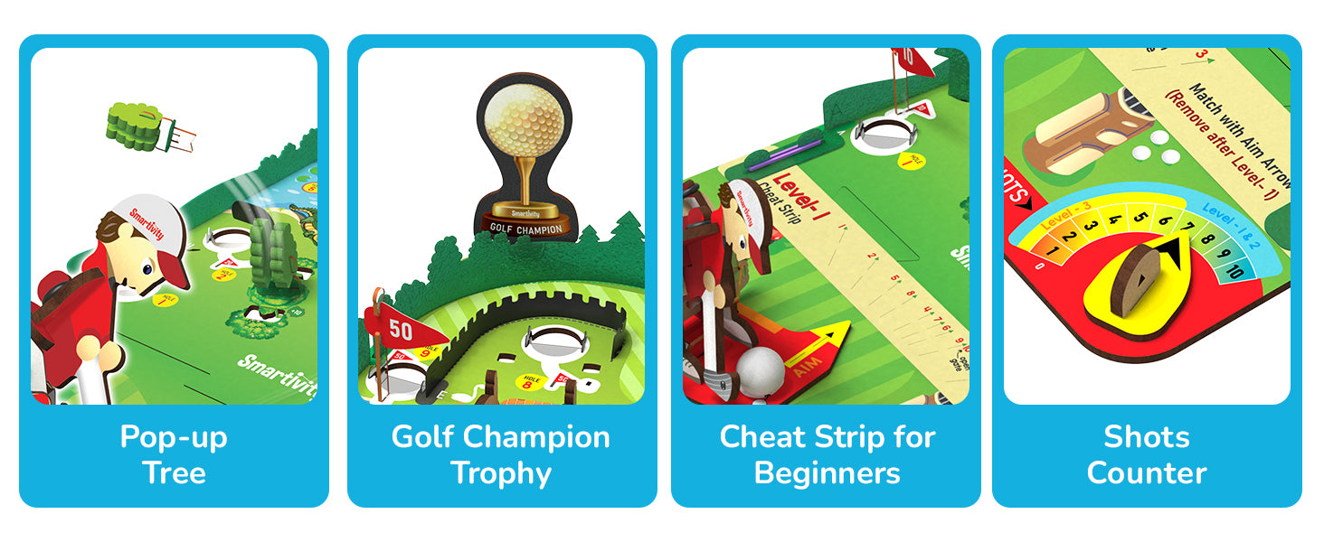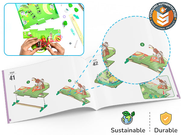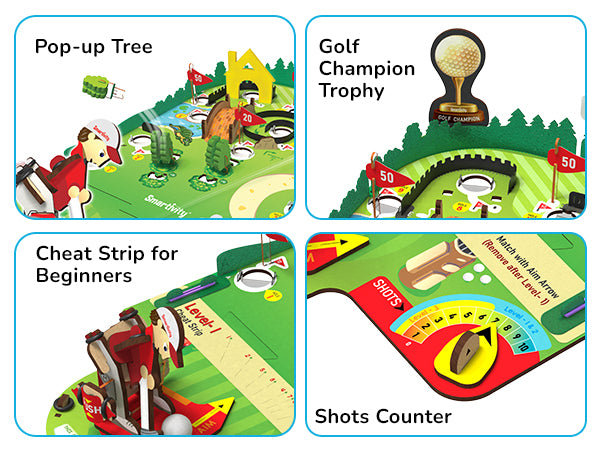 With this kit, your child will build a tabletop Mini Golf game. Aim and shoot the balls using a unique mechanical golf club. Putt the balls into the holes to collect Flag points. Hit the 'Tree Poppers' to make them fly. A cheat sheet is provided for beginners and a golf trophy for champions. The kit comes with easy-to-follow instructions and explanations of STEM concepts.