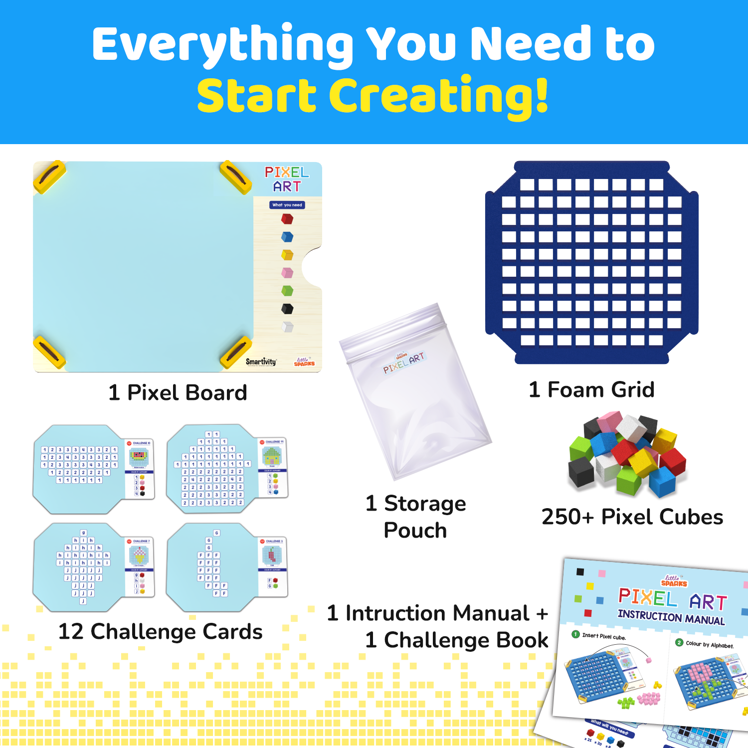 Boost your child's creative brainpower with this engaging Pixel Art game. In this game, your child will use over 250 colourful soft cubes, called Pixels, to recreate pictures by following challenge cards. The set includes a tray to neatly organise all the Pixels and a board for easy play. Its compact design makes cleanup a breeze and allows for convenient portability, making it perfect for screen-free fun during vacations or at home. Give your child the gift of imagination and creativity today!