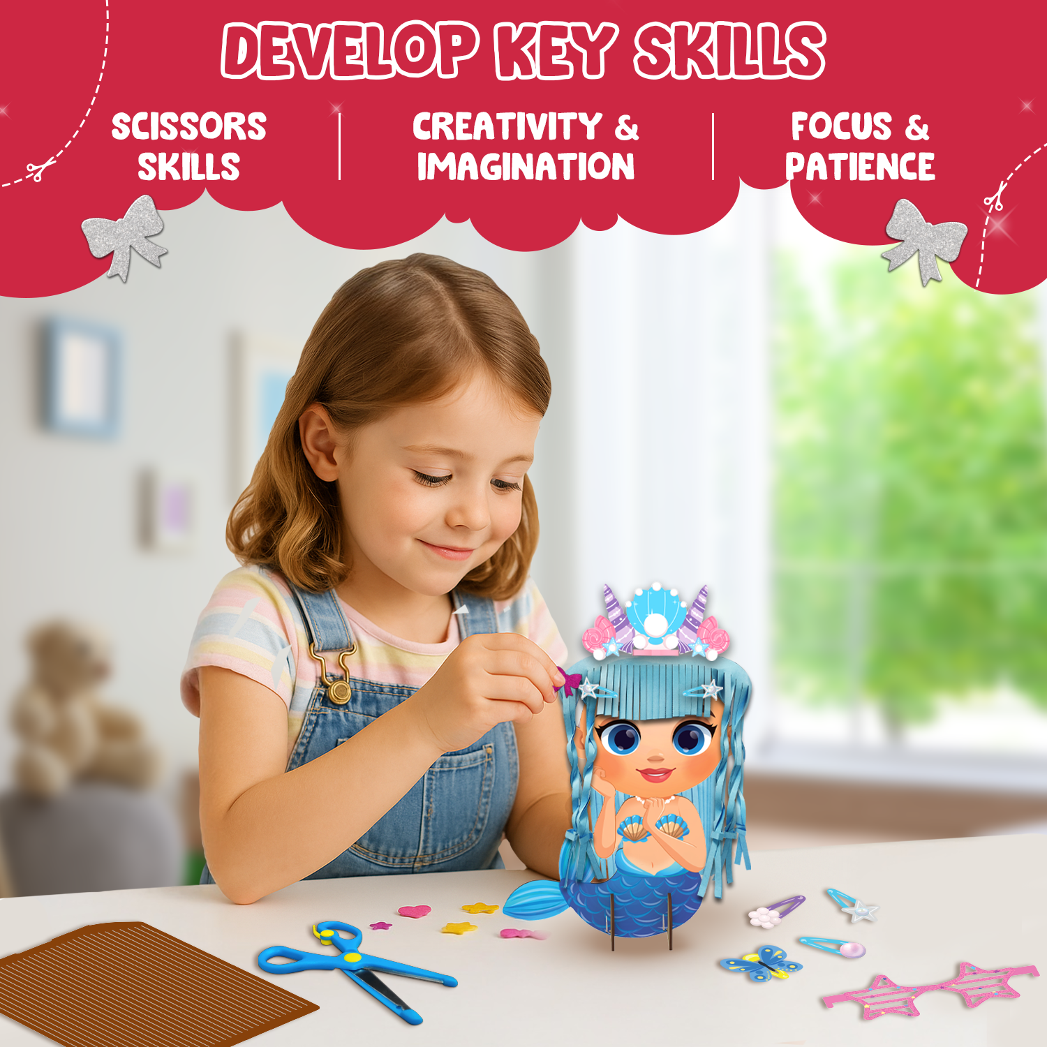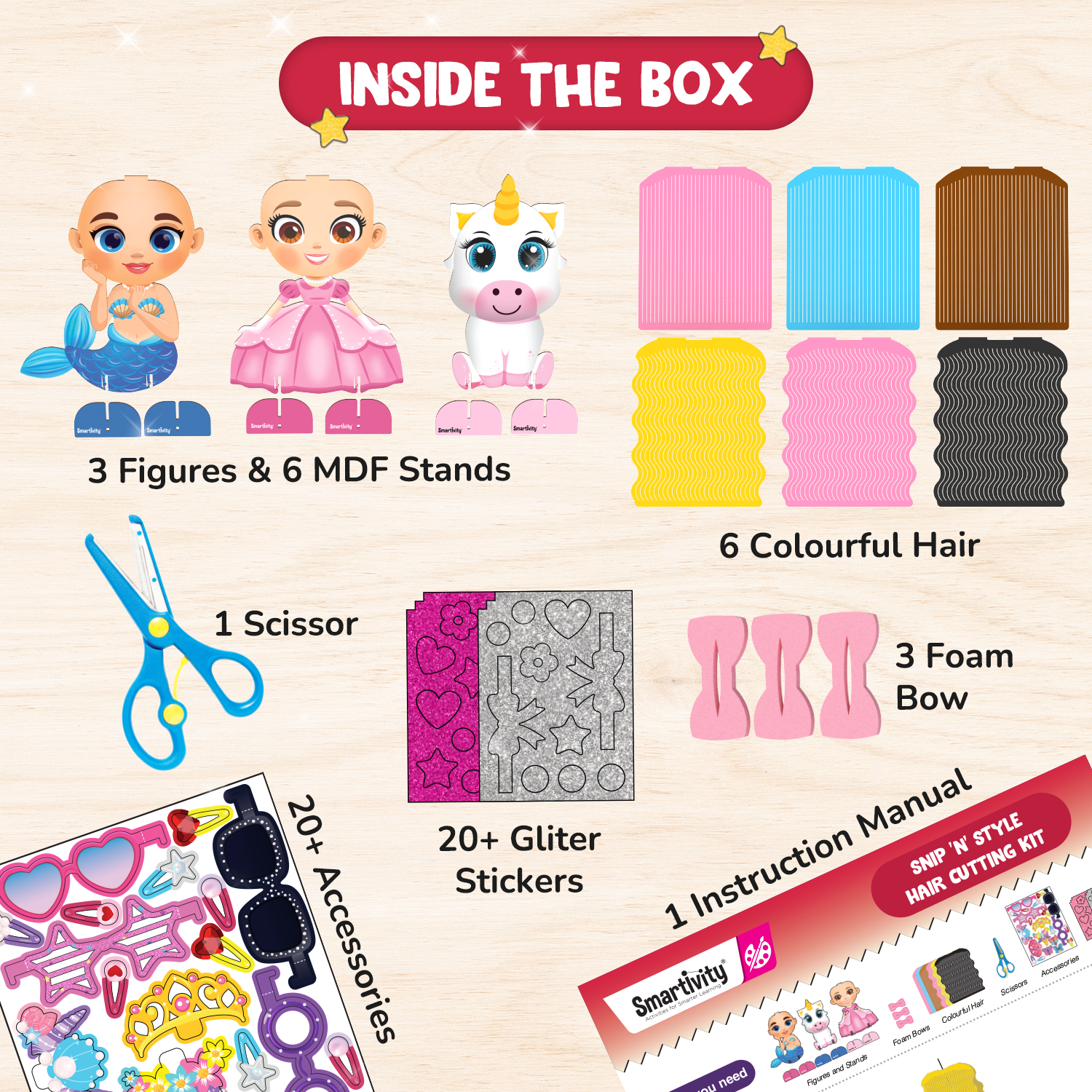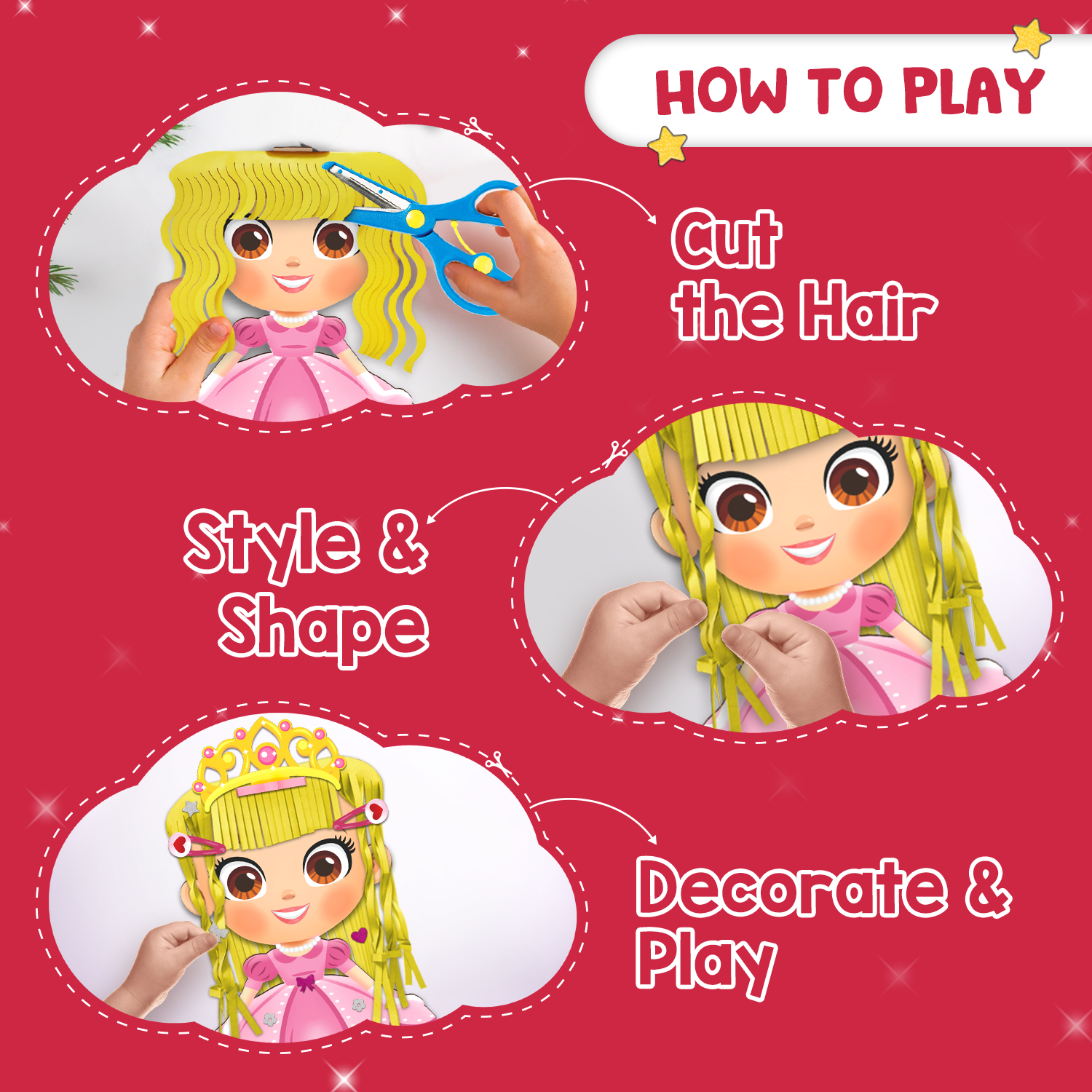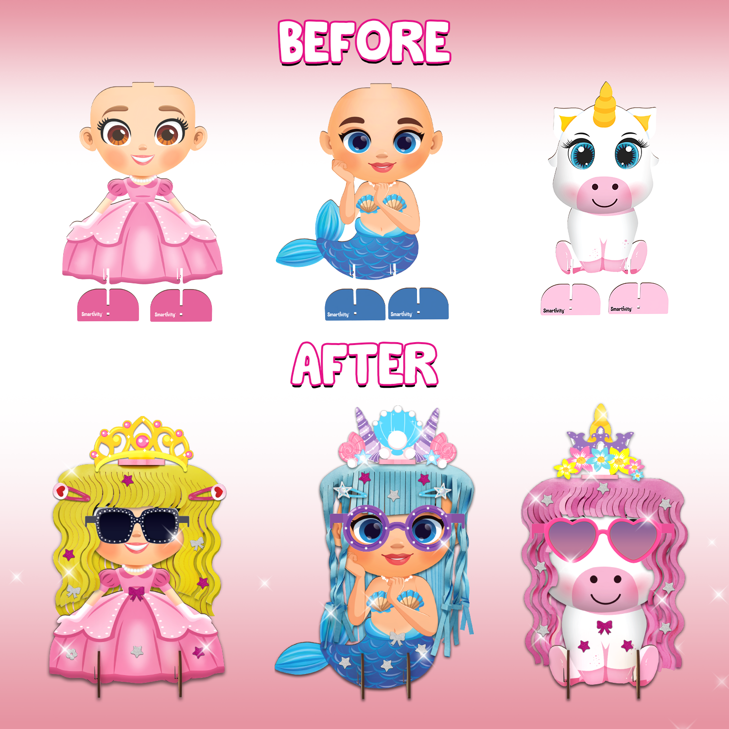 Welcome to a trendy world of hair and style! This kit includes 3 enchanting figures. Princess, Mermaid, and Unicorn, plus 6 sets of colorful paper hair, scissors, glitter stickers, crowns, and cute hairpins. Your child will cut, style, and decorate unique hairstyles, mixing sparkles and imagination. Packed with all the necessary materials and easy-to-follow instructions, this kit is a perfect blend of craft and pretend play for endless fun.